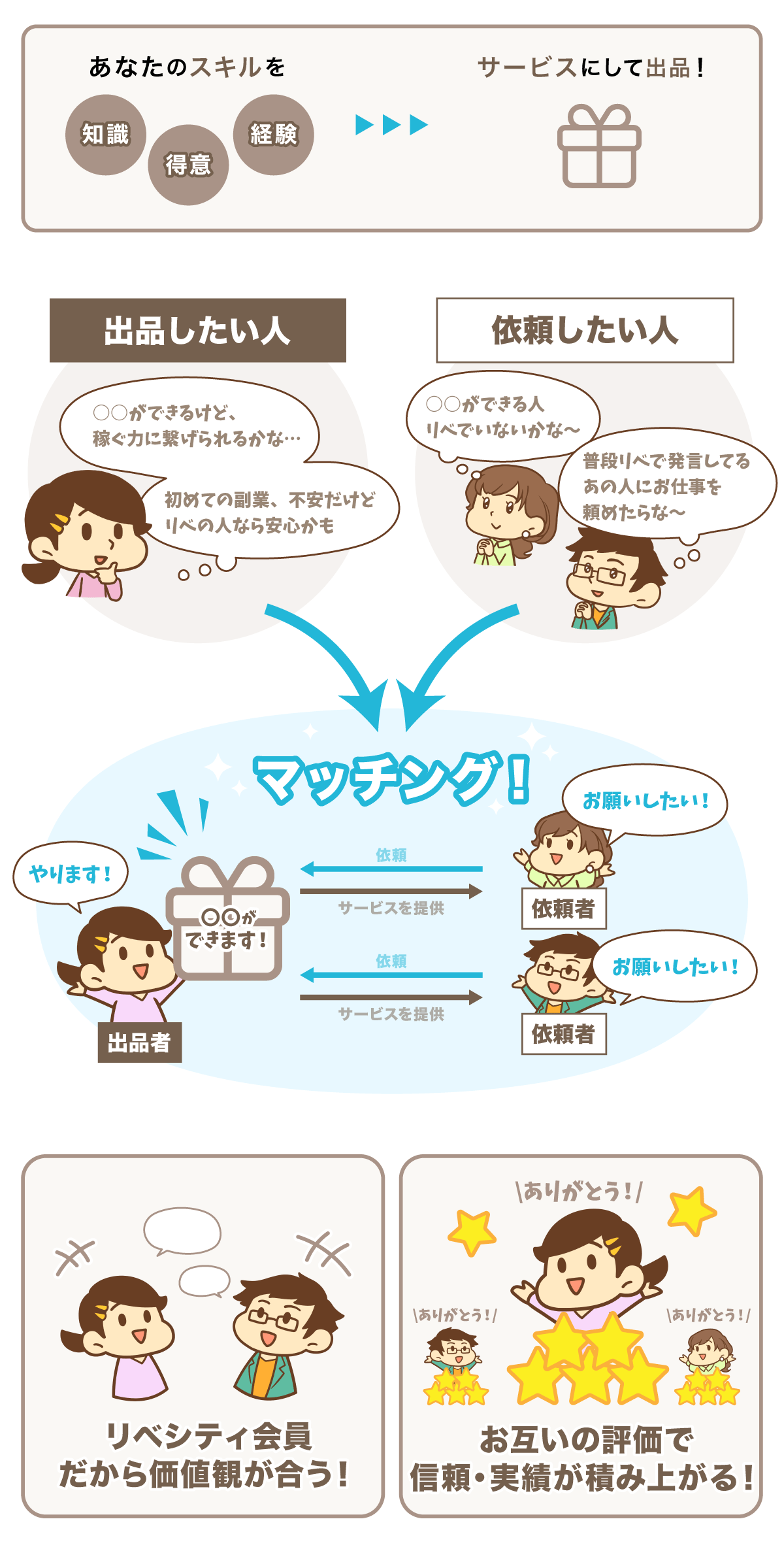 リベシティ会員が、スキル・知識・経験など、得意なことを『対面型のサービス』として出品し、会員同士で受発注をすることができます。